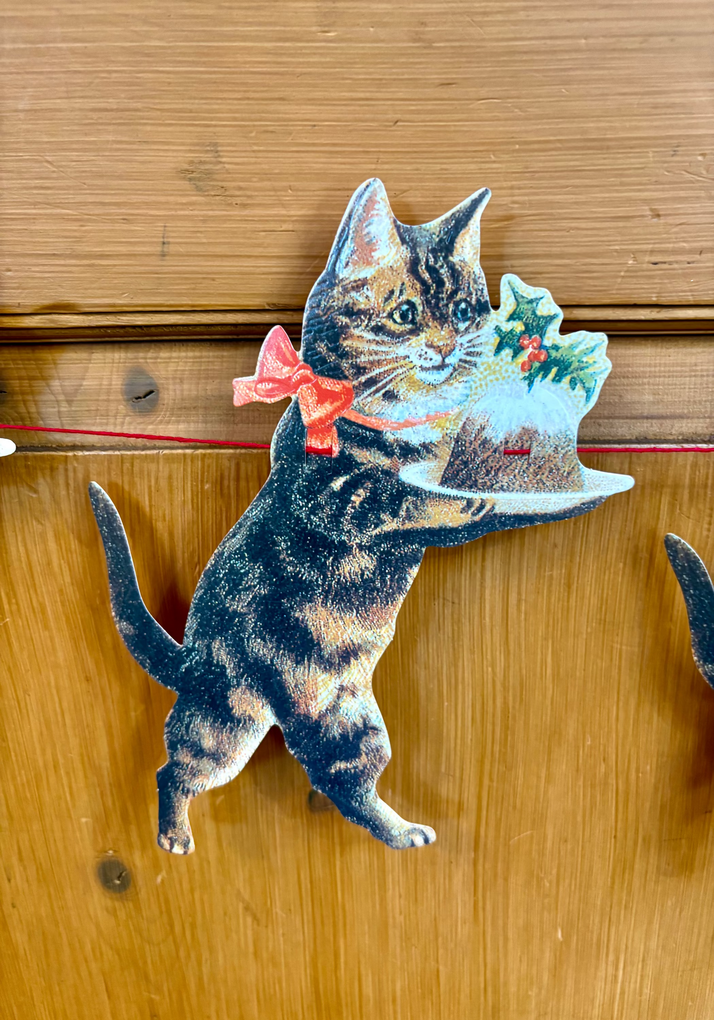 A beautiful garland featuring ten repeated motifs of a tabby cat carrying a Christmas pudding wearing a red bow, a perfect addition to your decorations at Christmas. Made in Great Britain.