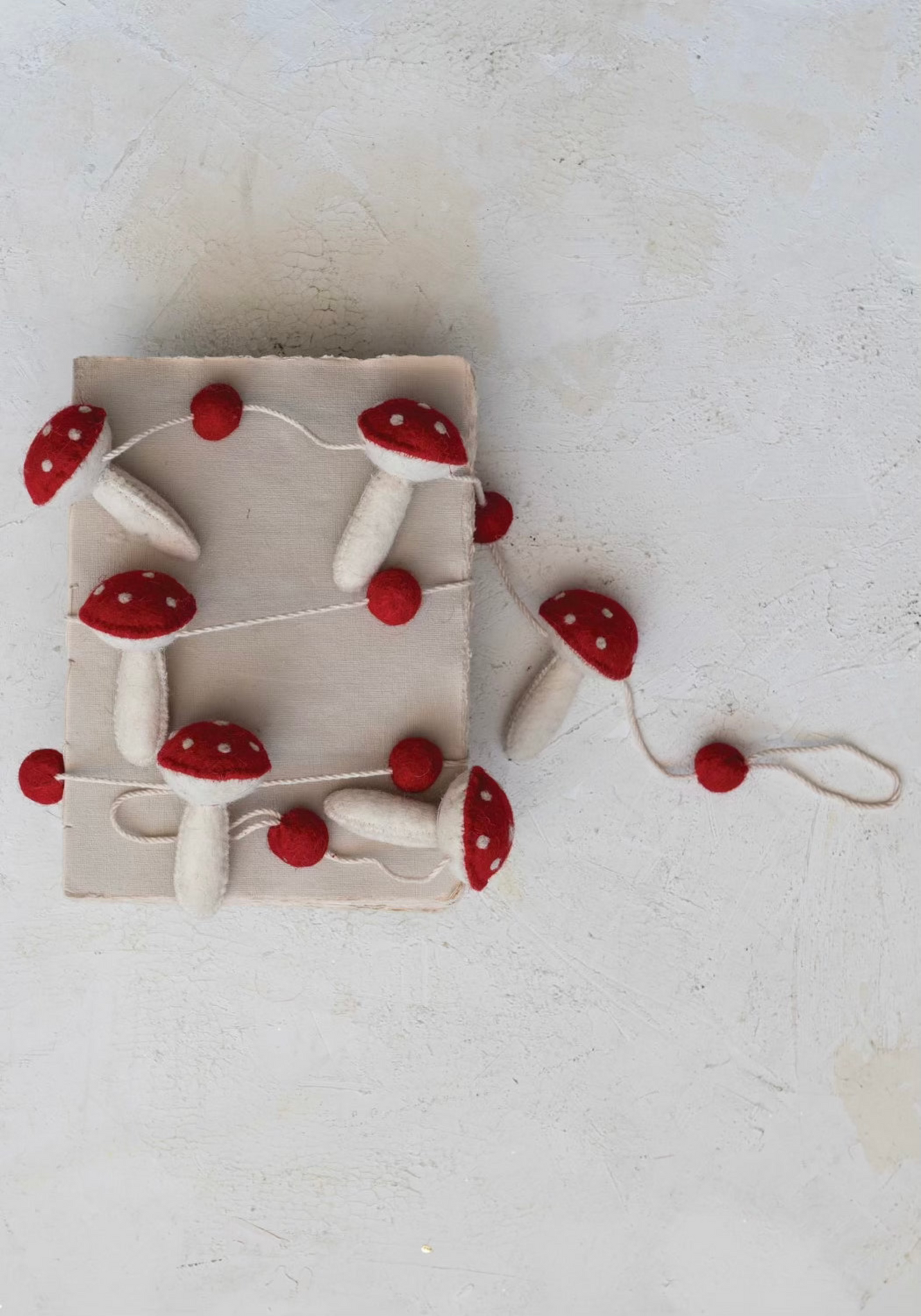 This enchanting garland captures the magic of a woodland wonderland with its red and white wool felt mushrooms and pom poms. Each element is handcrafted with care, creating a piece that's as delightful to touch as it is to view.