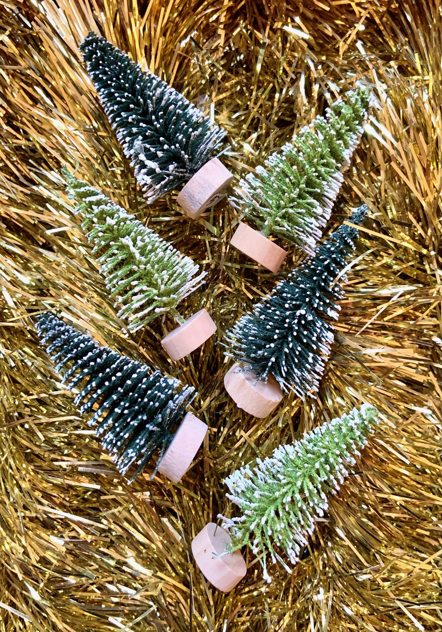 Set of six tiny bottle brush trees, three in light green and three in dark.