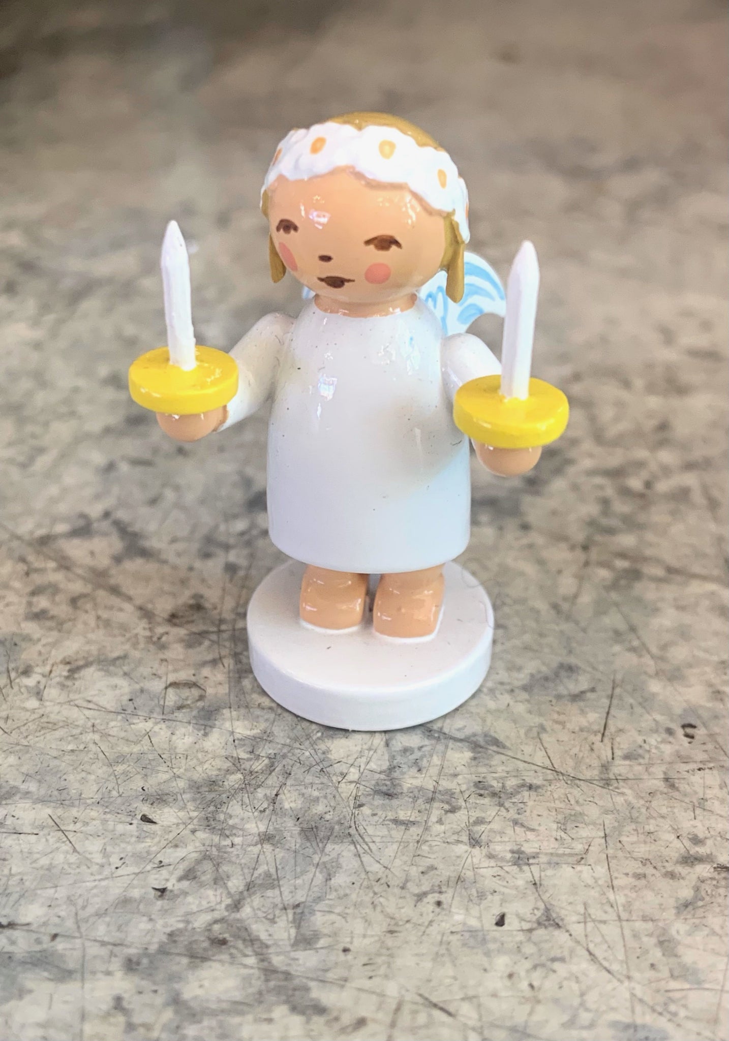 Wendt Kuhn has been hand-crafting German angels and flower children for over 100 years. This figure holds two candles and is from the Marguerite series, known for their childlike innocence and youthful sweetness.